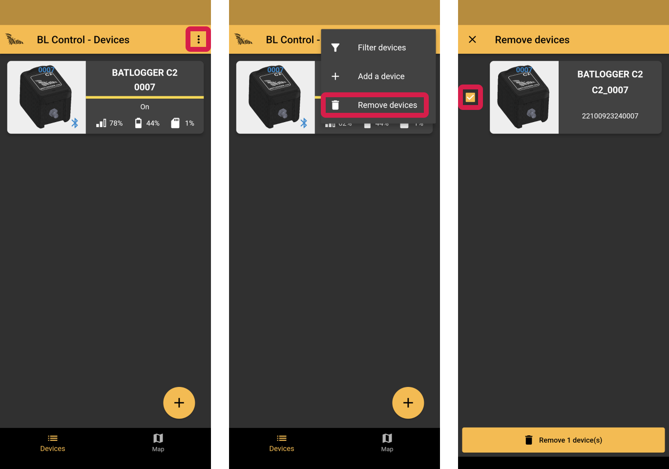 Click on the 3 dots to open the menu, choose remove devices, tick the ones you want to remove and click on remove (1) devices.